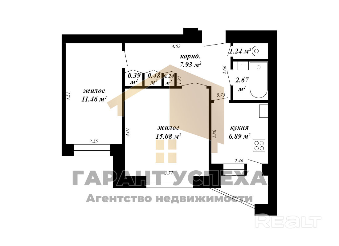 Удобная планировка: две жилые комнаты (11.46 м2 и 15.08 м2), раздельный санузел. В квартире имеется застеклённая лоджия с выходом из кухни.