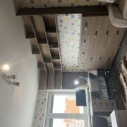 Квартира расположена в самом центре города и выполнена с качественным современным ремонтом. Все делалось для себя — продуманно, надежно и с расчетом на долгие годы эксплуатации. Использованы качественные материалы, установлена проверенная техника европейских брендов, мебель изготовлена под заказ, в спальне — кованая мебель.