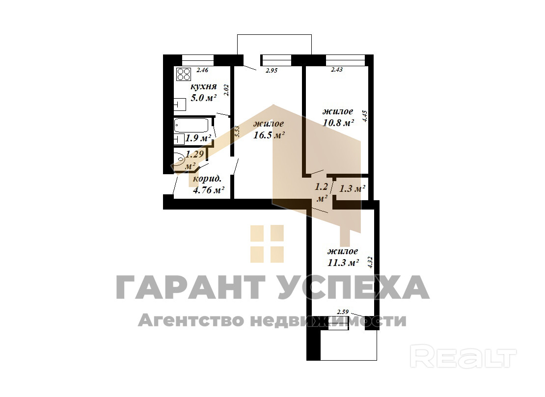 Удобная планировка: три жилые комнаты (16.5 м2, 11.3 м2 и 10.8 м2), раздельный санузел. В квартире имеется балкон с выходом из зала и лоджия с выходом из спальни.