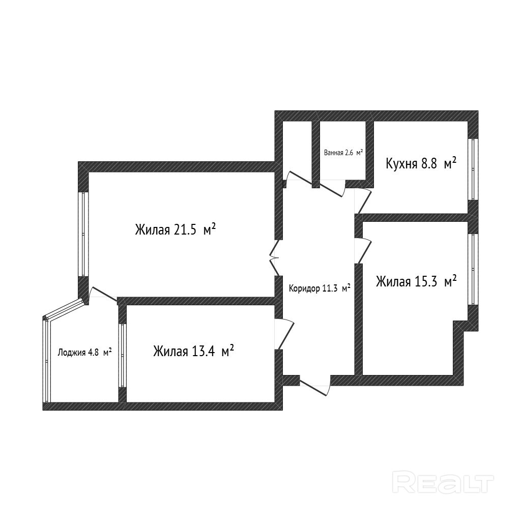 ! Три изолированные большие комнаты 21,5 м кВ, 15, 3 м кВ, 13,4 м кВ ( одна из них с большой нишей)
