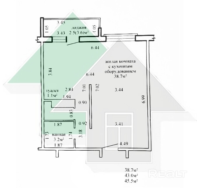 Предлагаем купить 1-комнатную квартиру-студию в новостройке по ул.Лейтенанта Рябцева (р-н Дубровка) в г.Бресте. Площадь общая по СНБ 45,5 м2, жилая комната с кухонным оборудованием 38,7 м2! Окна во французском стиле. Панельный дом 2025 г.п., этаж 6 из 7, раздельный с/у, застекленная лоджия. Светлая и тёплая квартира с ремонтом. Входная дверь металлическая, пол- ламинат, потолки натяжные с точечным освещением, санузел и ванная комната облицованы плиткой современного образца, стены выровнены. Чистый и новый подъезд. Оборудовано видеонаблюдение. Динамично развивающийся район: магазины, Дубровский лесопарк, остановки общественного транспорта и т.п. Код объекта 26049 Договор № 49 от 18.03.2026 г.
