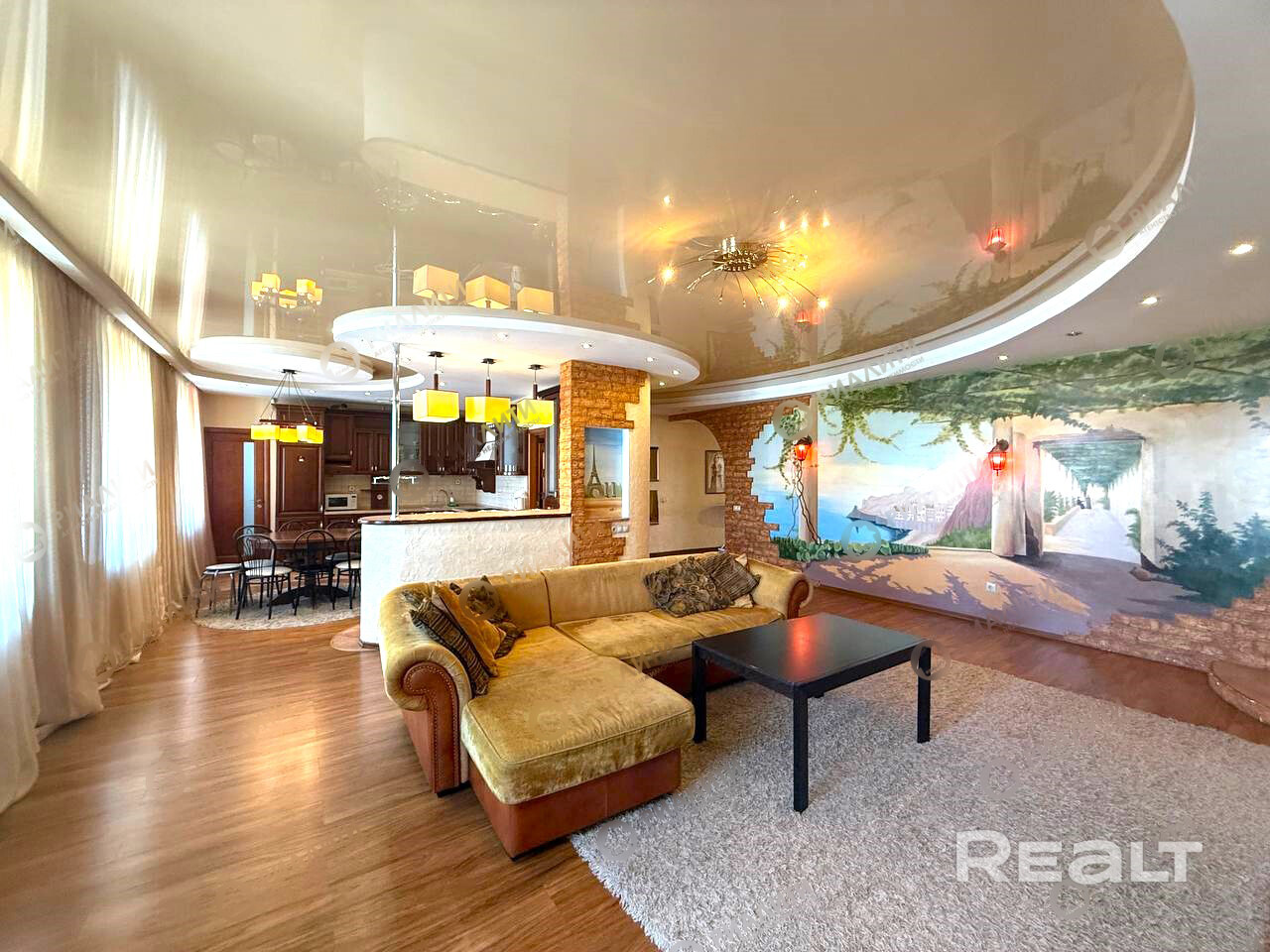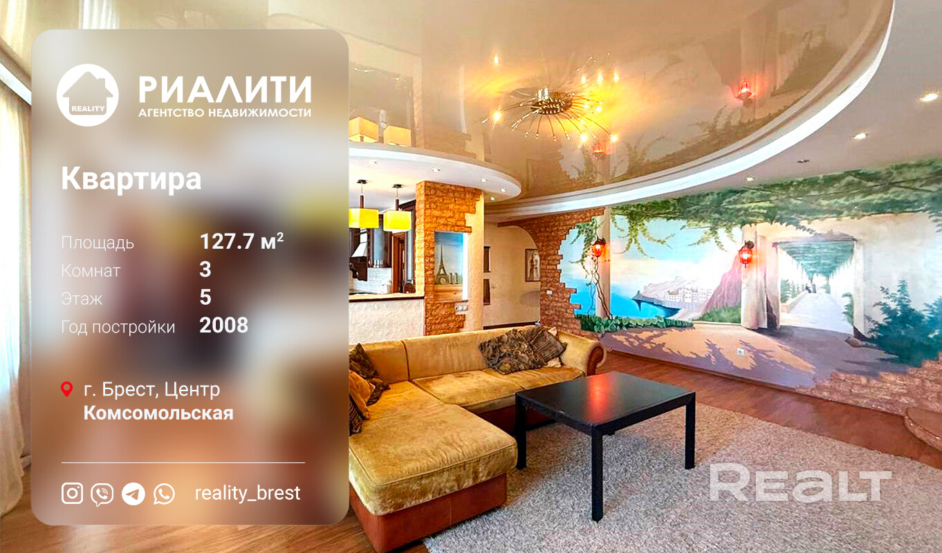 Мы работаем от собственника! Покупая этот объект, Вы не платите агентству комиссию! Уникальное предложение! В историческом центре г. Бреста продается 3-х комнатная квартира улучшенной планировки с сауной! Квартира площадью 127,7/ 122,9/69,2/20 м2 находится на 5 этаже пятиэтажного кирпичного дома 2008 года постройки. Дом с лифтом! В квартире функционально расположены: просторная гостиная 35,3 м2 с камином, которая объединена в единое пространство с 20-метровой кухней. Далее две изолированные спальные комнаты с общей застекленной лоджией, также имеется обустроенная гардеробная, два санузла и сауна. В квартире современный дизайнерский ремонт материалами премиум класса. Идеально подобраны элементы декора, уютную обстановку зала создает камин в ее центральной части. Стиль и рациональность - вот составляющие внутреннего пространства квартиры . Потолки многоуровневые глянцевые с разноплановой системой освещения, стены- декоративная покраска с элементами каменной кладки и обои,. В зале красивая настенная художественная роспись. Полы ламинат и плитка. Окна ПВХ с широкими подоконниками. Два санузла, один из которых с джакузи , облицованы современной керамической плиткой. Заменены все сантехнические трубы и полотенцесушитель. Просторная кухня 20 м2 с барной стойкой, полностью укомплектована всеми необходимыми бытовыми приборами. Изюминка данной квартиры- сауна с электрической печью и душевой. Отличное предложение для комфортного и удобного проживания в центральной части г. Бреста на улице Комсомольской , в шаговой доступности от красивой парковой зоны отдыха с прудом и развлечениями на любой вкус. Вся необходимая инфраструктура представлена в полном объёме.