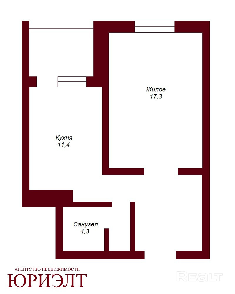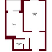 Общая площадь - 43,6 м2, из которых просторная комната 17,3 м2, кухня 11,4 м2 с выходом на лоджию, совмещённый санузел и просторная прихожая.