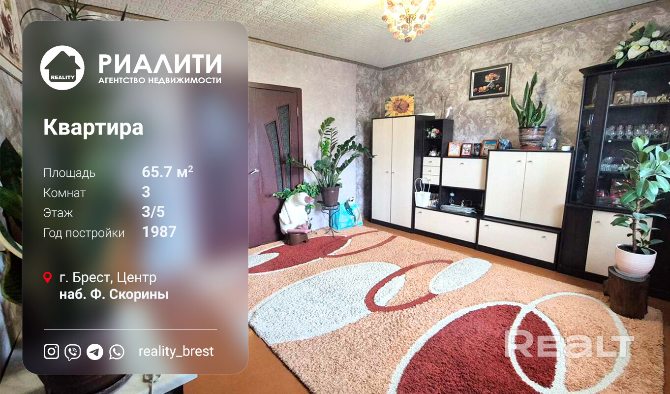 Покупая этот объект, ПОКУПАТЕЛЬ не платит агентству комиссию! Предлагаем купить просторную 3 -х комнатную квартиру, расположенную в центральной части города по адресу г. Брест, наб. Франциска Скорины 1987 г. п., 3/5 этажного кирпичного дома. Общая площадь по СНБ 65.7 кв. м, общая 63.2 кв. м., жилая 38.7 кв. м., кухня 8,4 кв. м, санузел раздельный, имеется большая застекленная лоджия с выходом из гостиной.