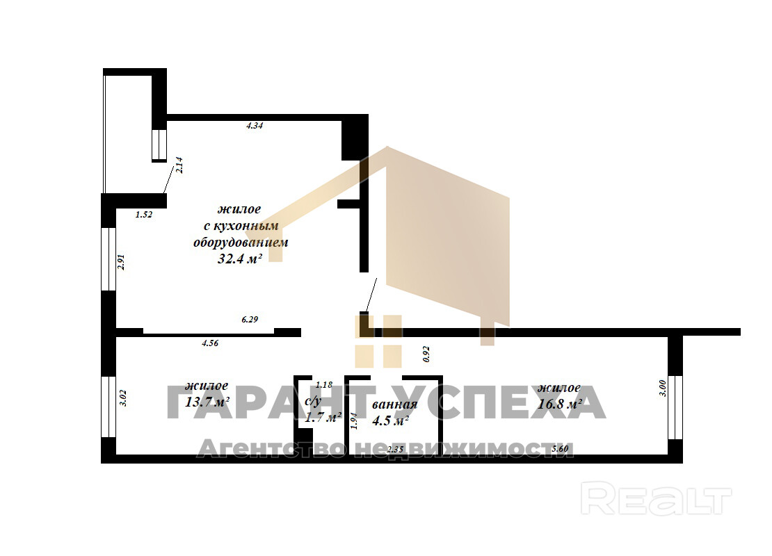 Удобная планировка: просторная кухня-гостиная (32,4 кв.м), лоджия с панорамным остеклением - 3,5 кв.м, две изолированные комнаты - 13,7 кв.м и 16,8 кв.м, раздельный санузел, коридор.