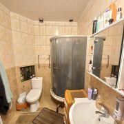 Совмещенный санузел с душевой кабиной облицован плиткой.