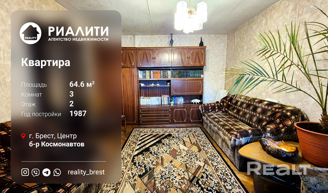Мы работаем от собственника! Покупая этот объект, ПОКУПАТЕЛЬ не платит агентству комиссию! Предлагаем купить 3-комнатную квартиру, расположенную в центральной части города по адресу г. Брест, ул. бульвар Космонавтов (район Газоаппарата), 1987 г. п., 2/9 этажного кирпичного дома, с раздельным санузлом и застекленной лоджией. Три изолированные комнаты. Общая площадь по СНБ 64,6 кв. м, общая 62,7 кв. м., жилая 40,9 кв. м., кухня 8,3 кв. м., высота потолков 2,55 м.