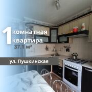 Предлагается 1-комнатная квартира в центре города на улице Пушкинская, расположенная на первом этаже девятиэтажного панельного дома, построенного в 1978 году. Общая площадь квартиры составляет 37.1 кв. м, из которых 17.1 кв. м отведено под комнату, а 7.5 кв. м занимает кухня. В квартире выполнен раздельный санузел, облицованный плиткой современного образца. Она находится в жилом состоянии: сантехника и электрика были заменены, установлены пластиковые стеклопакеты, входная дверь металлическая.