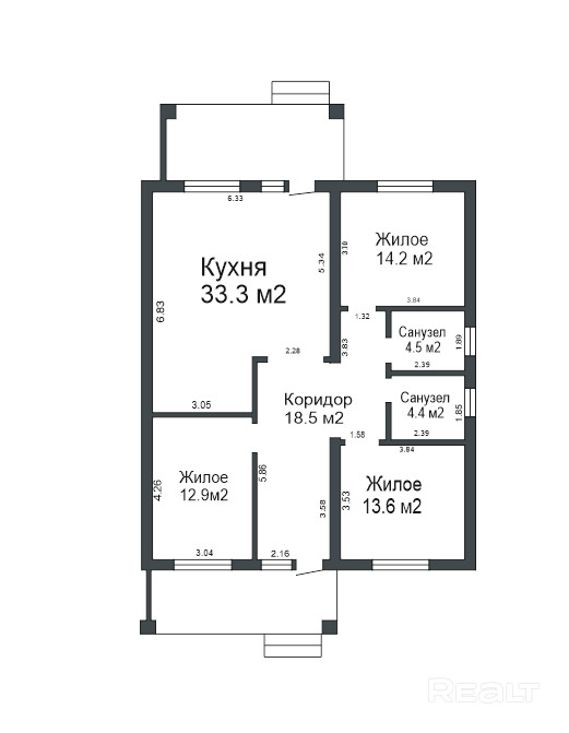 Кухня-гостинная-33 кв.м. 3 изолированных спальни.