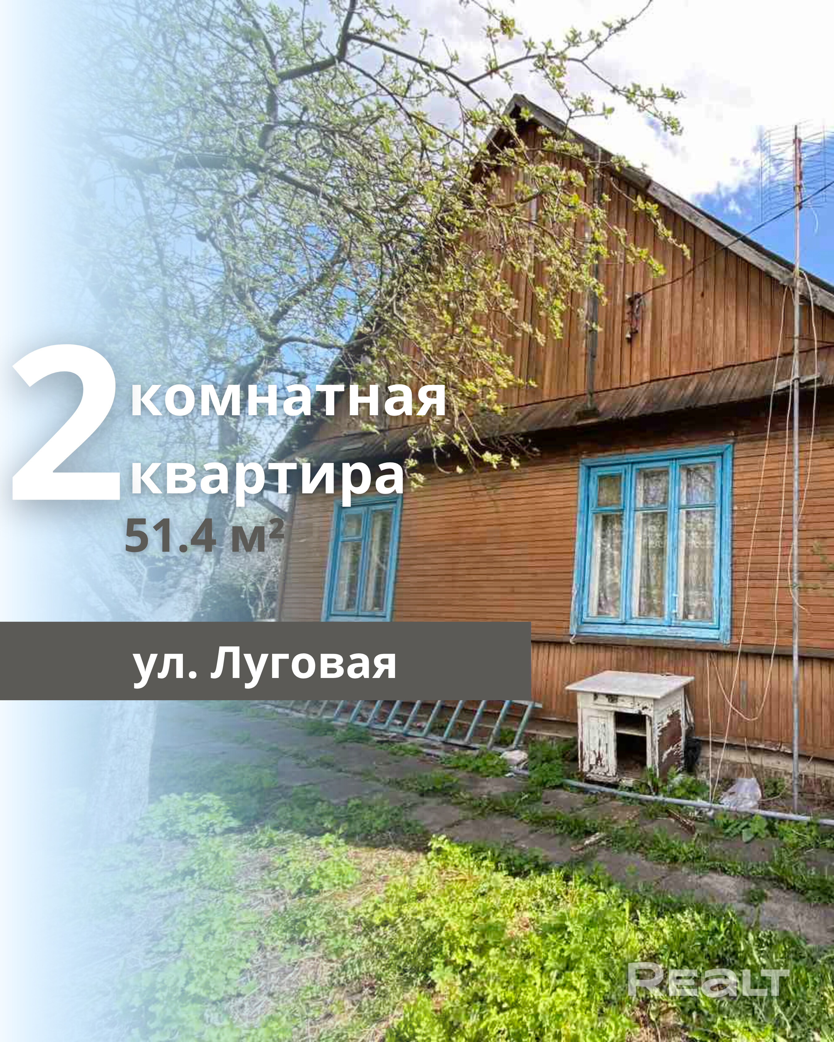 Продается квартира в блокированном жилом доме в городе Брест, микрорайон Граевка, по договору 88/2 от 20.04.2026 по цене 47 500 рублей. Общая площадь квартиры составляет 51,4 кв.м и включает две жилые комнаты, кухню, коридор и совмещенный санузел (51.4/34.8/11.7 кв.м). Высота потолка достигает 2,80 м. Дом построен в 1926 году, стены выполнены из бруса, кровля - шифер, окна и двери - деревянные. Все коммуникации централизованные: газ, водоснабжение, электричество и канализация. В наличии также погреб и сарай. Земельный участок правильной формы площадью 5,93 сотки. Квартира расположена в районе с развитой инфраструктурой, фактически в центре города, с отличным транспортным сообщением. В непосредственной близости находятся остановка общественного транспорта, железнодорожная больница, детская поликлиника, центральный рынок, университет, аптеки и магазины.