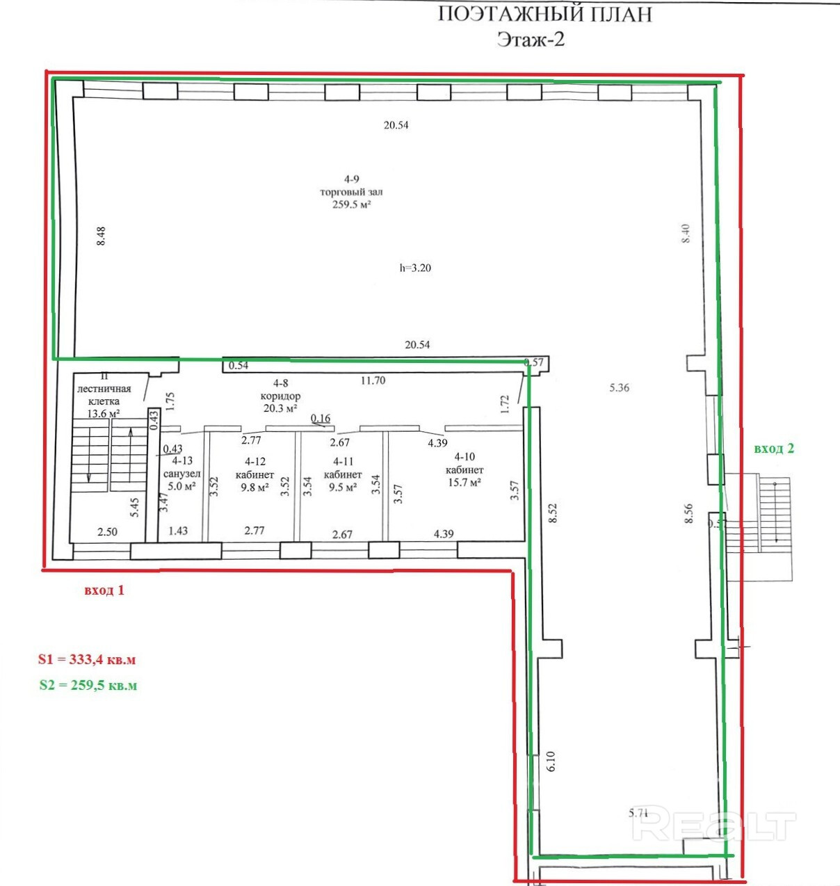 - S1 (см.план) = 333,4 м2 ; S2 (см.план) = 259,5 м2