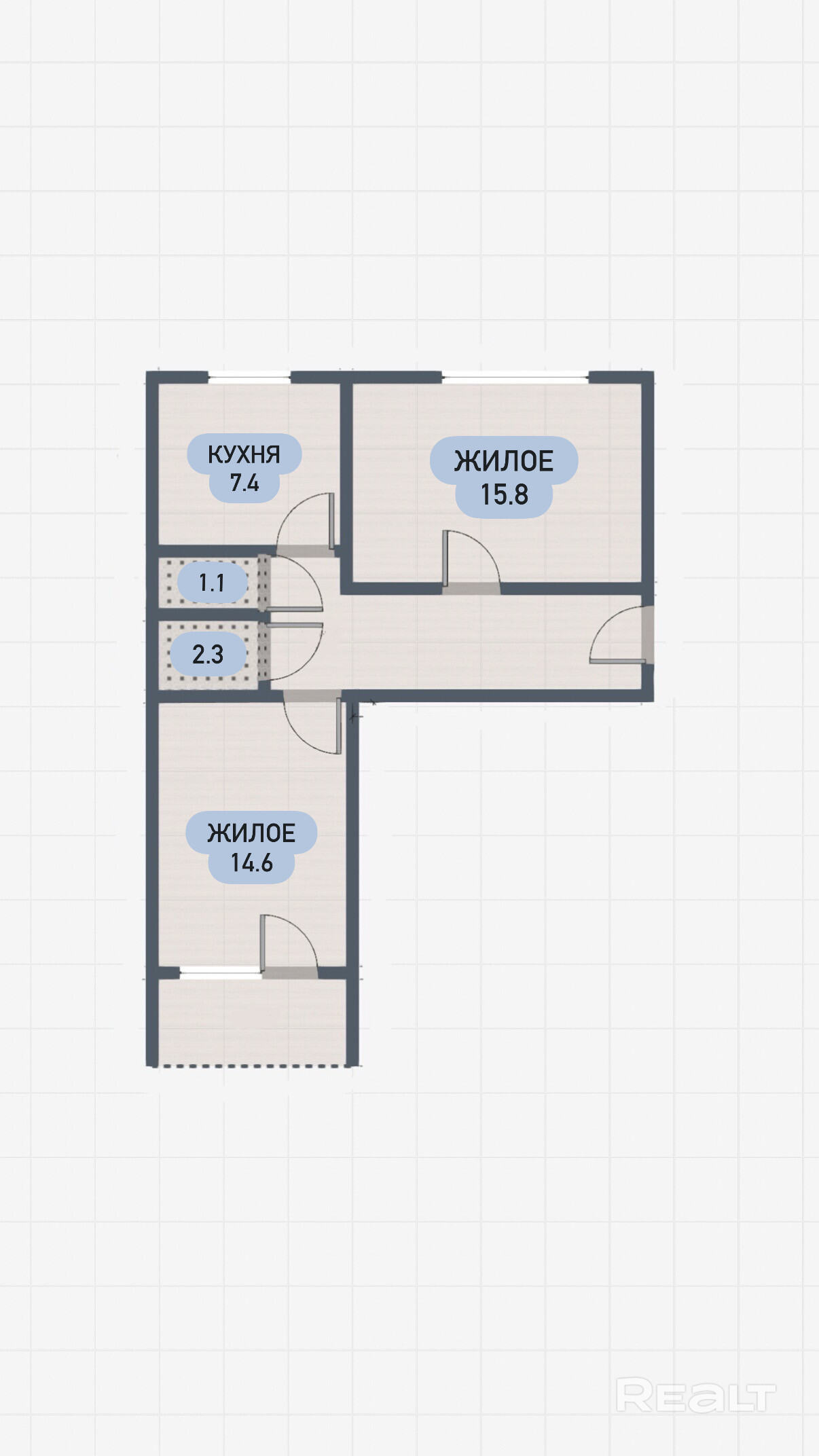 Общая площадь квартиры составляет 51,8 м2, жилая площадь – 30,4 м2, а площадь кухни – 7,4 м2. Площадт продаваемой комнаты - 14.6 м2, с выходом на лоджию.