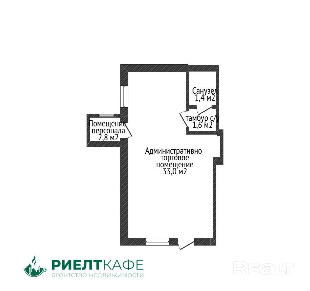 Полезная площадь торгового зала составляет 33,0 кв.м, гардеробная персонала 2.8 кв.м,