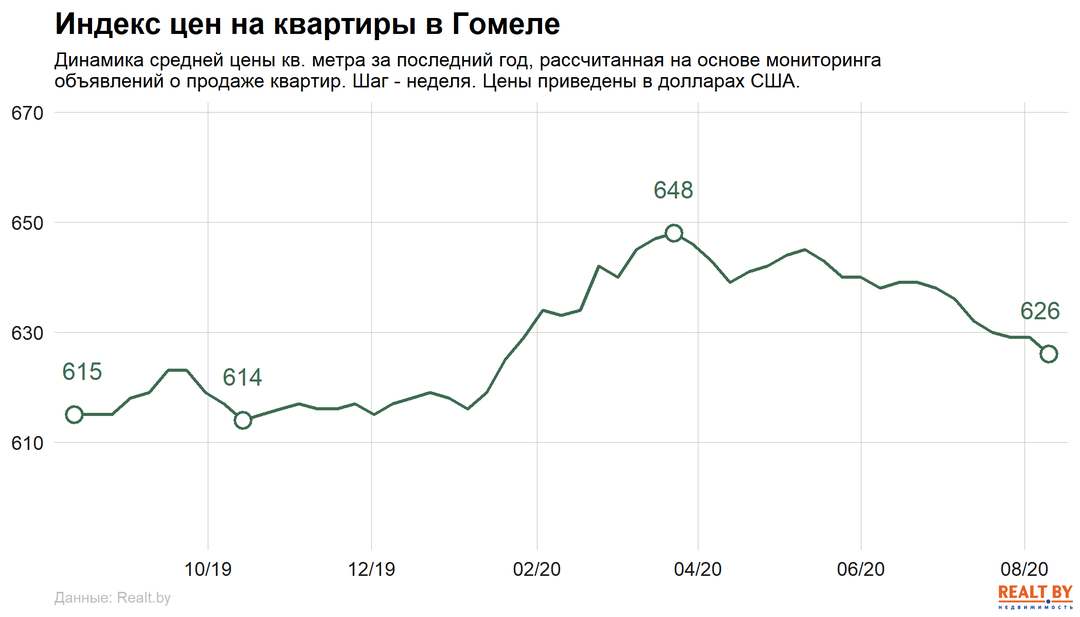 На 1.4% снизилась средняя цена 1-комнатных квартир, которые на данный момент продаются в среднем по 648 $/м2. Средняя цена на 2-комнатные квартиры в Гомеле составляет 625 $/м2 (+0.8% за неделю). За 3-комнатные квартиры в областном центре просят в среднем 623 $/м2, что на 1.1% меньше, чем неделей ранее.