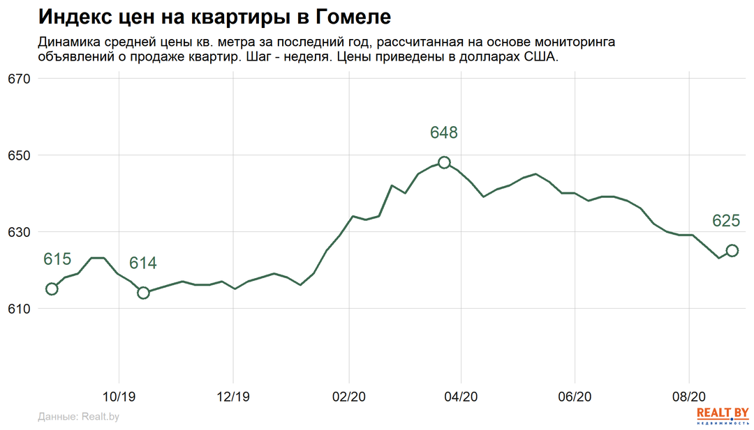 Средняя цена в объявлениях о продаже квартир в Гомеле выросла на 0.2% и составила 625 $/м2.