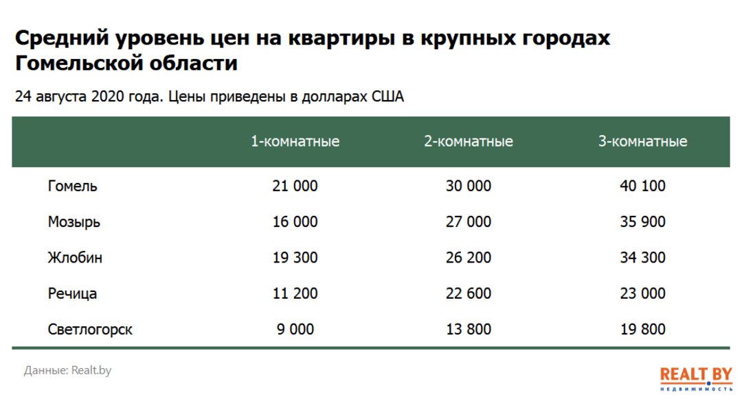 Мониторинг цен предложения квартир в Гомеле и городах Гомельской области за 17−24 августа 2020 года