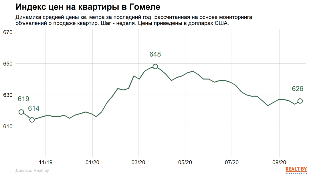 Средняя цена в объявлениях о продаже квартир в Гомеле выросла на 0.2% и составила 626 $/м2.