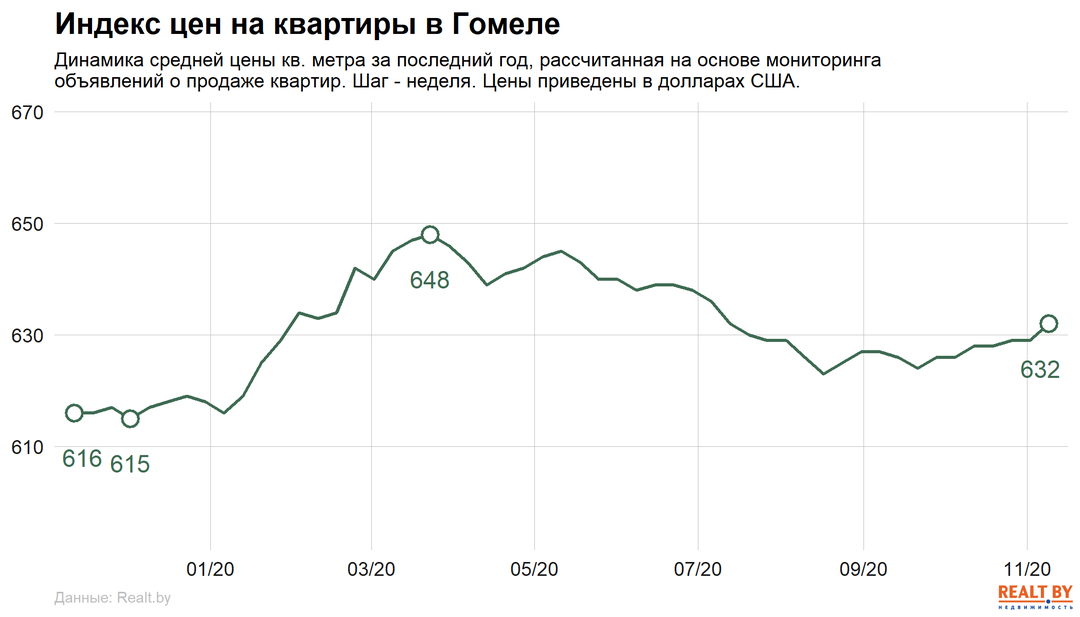 Средняя цена в объявлениях о продаже квартир в Гомеле выросла на 0.5% и составила 632 $/м2.
