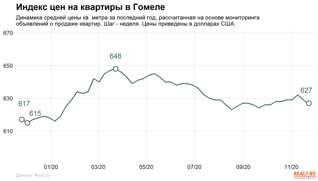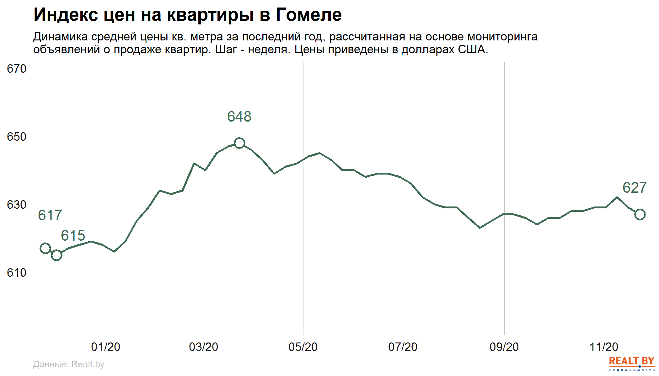 Средняя цена в объявлениях о продаже квартир в Гомеле снизилась на 0.3% и составила 627 $/м2.