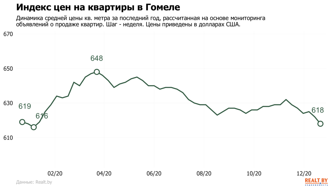 Средняя цена в объявлениях о продаже квартир в Гомеле снизилась на 0.6% и составила 618 $/м2.
