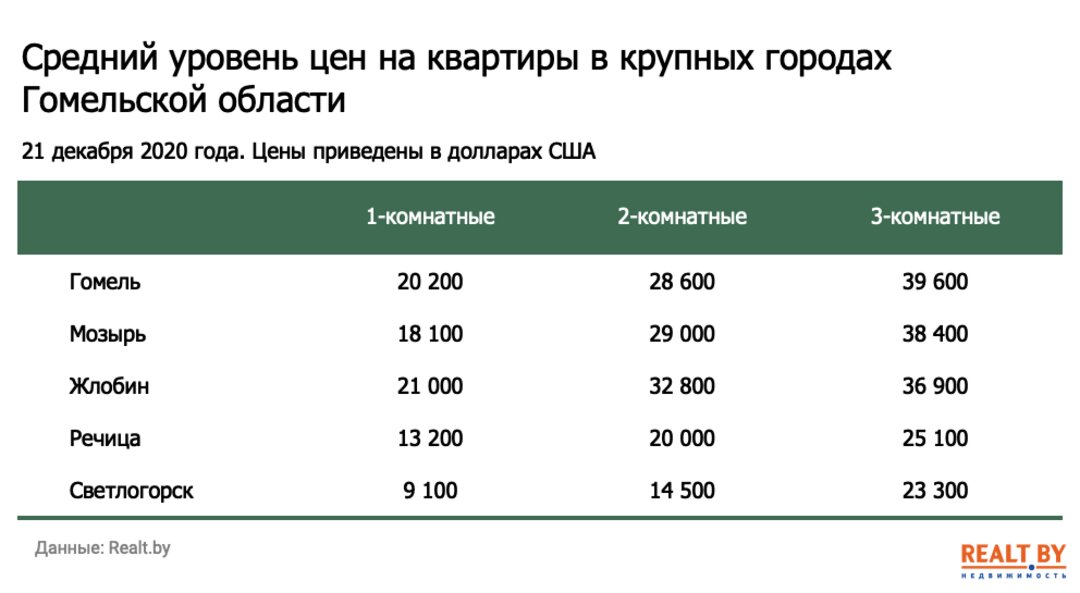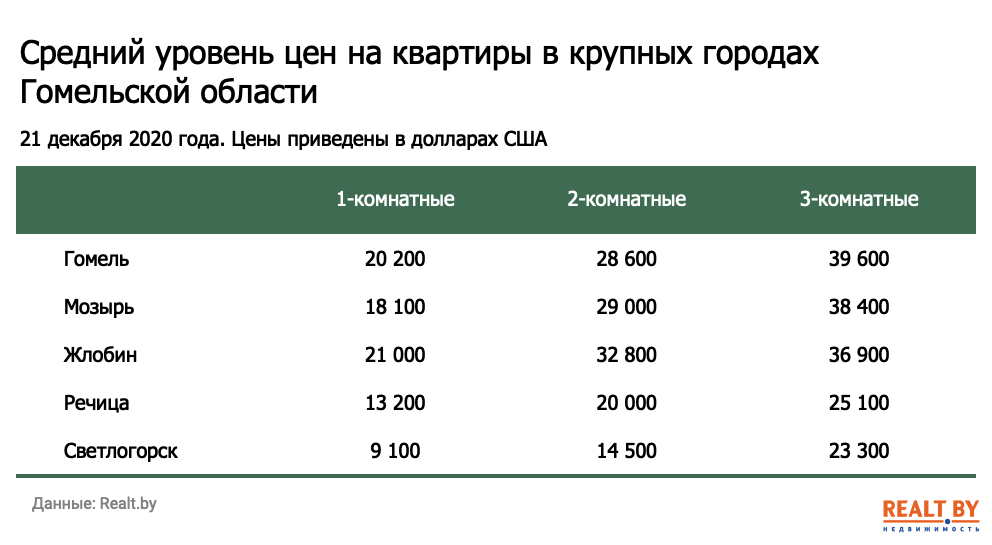 Мониторинг цен предложения квартир в Гомеле и городах Гомельской области за 14−21 декабря 2020 года