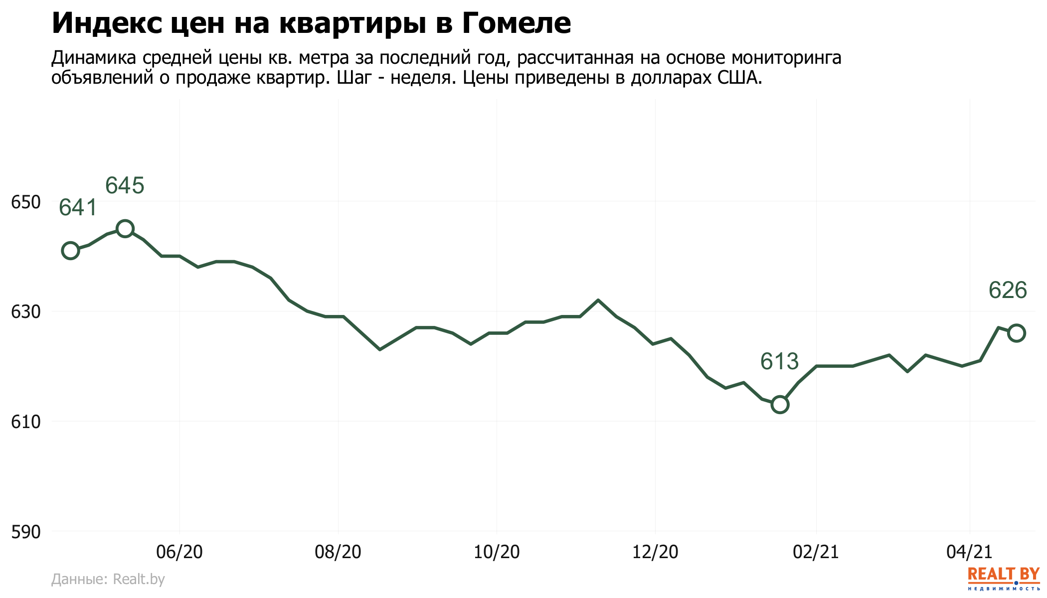 Средняя цена в объявлениях о продаже квартир в Гомеле снизилась на 0.2% и составила 626 $/м2.