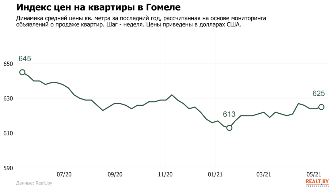 Средняя цена в объявлениях о продаже квартир в Гомеле выросла на 0.2% и составила 625 $/м2.