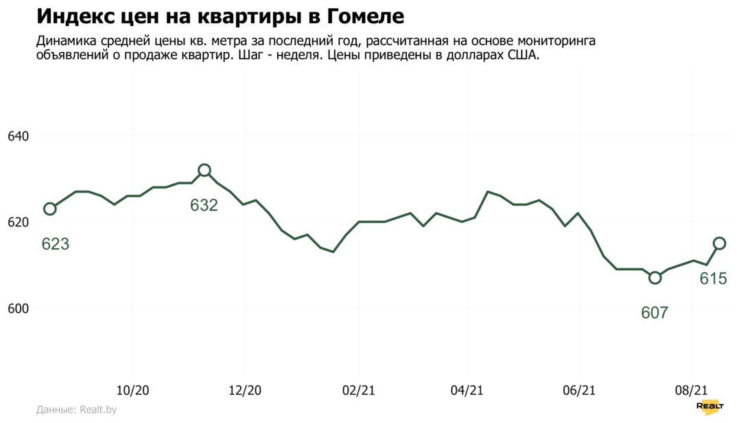 Средняя цена в объявлениях о продаже квартир в Гомеле выросла на 0.8% и составила 615 $/м2.