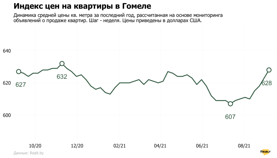 Средняя цена в объявлениях о продаже квартир в Гомеле выросла на 0.8% и составила 628 $/м2.