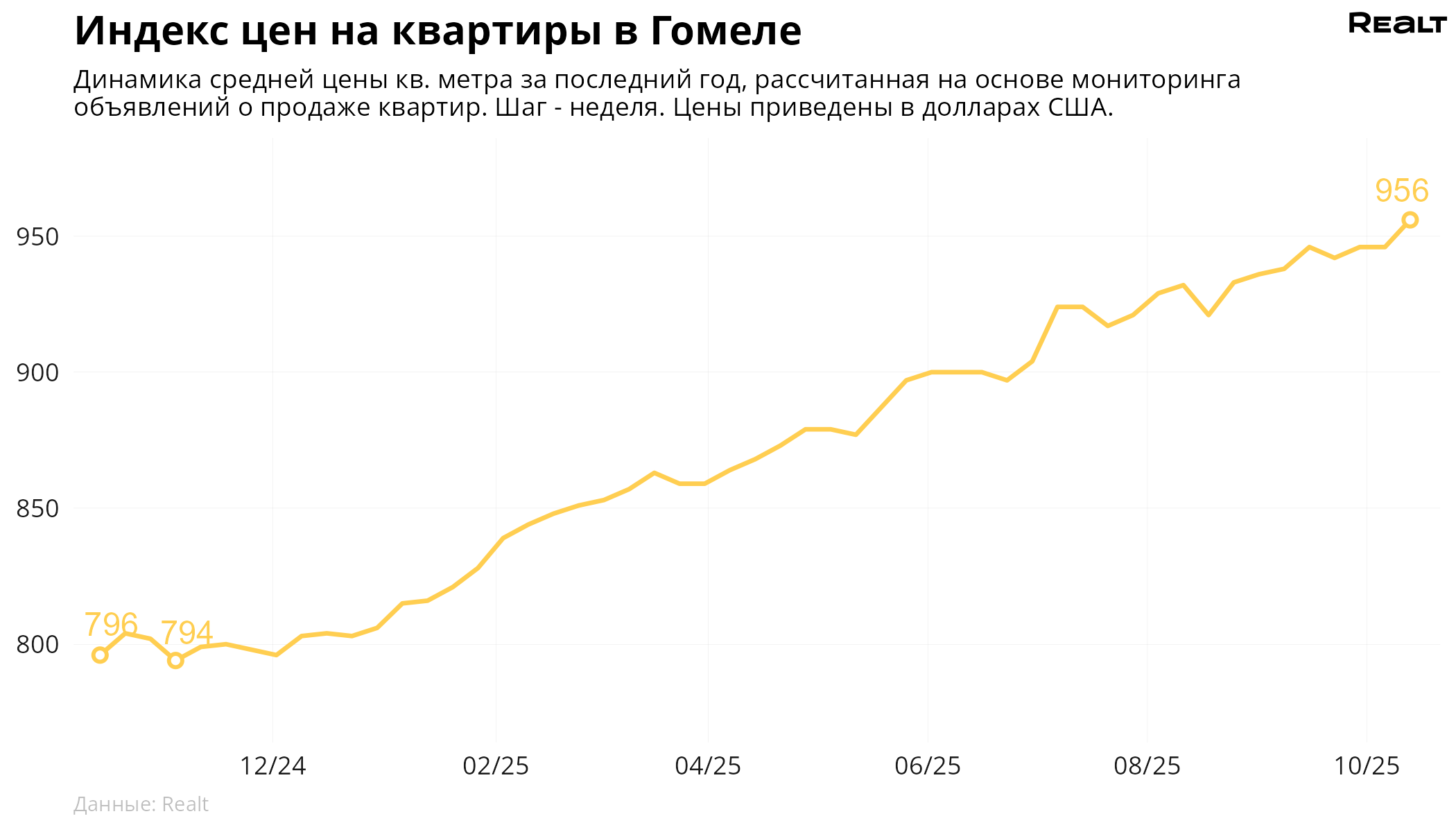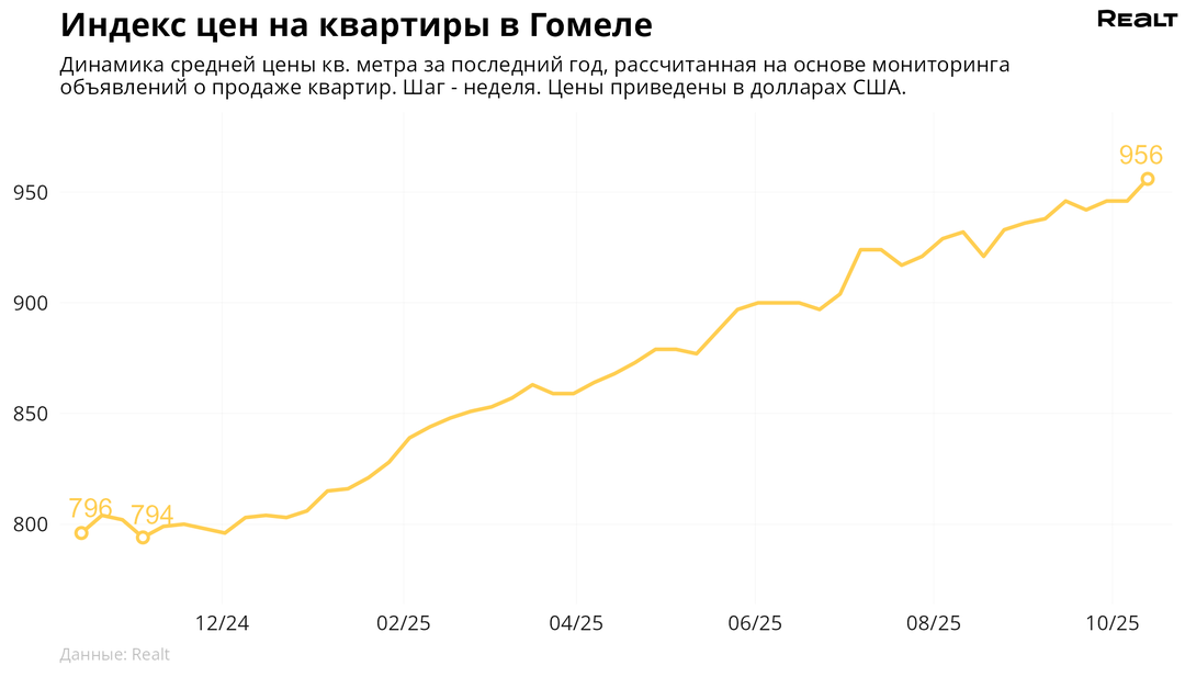 112За неделю, с 6 по 13 октября 2025 года, средняя цена в объявлениях о продаже квартир в Гомеле выросла на 1.1% и составила 956 $/м2. При этом количество квартир в продаже уменьшилось на 0.5%. Что еще произошло на рынке жилья крупнейших городов Гомельской области за семь дней — в материале.
