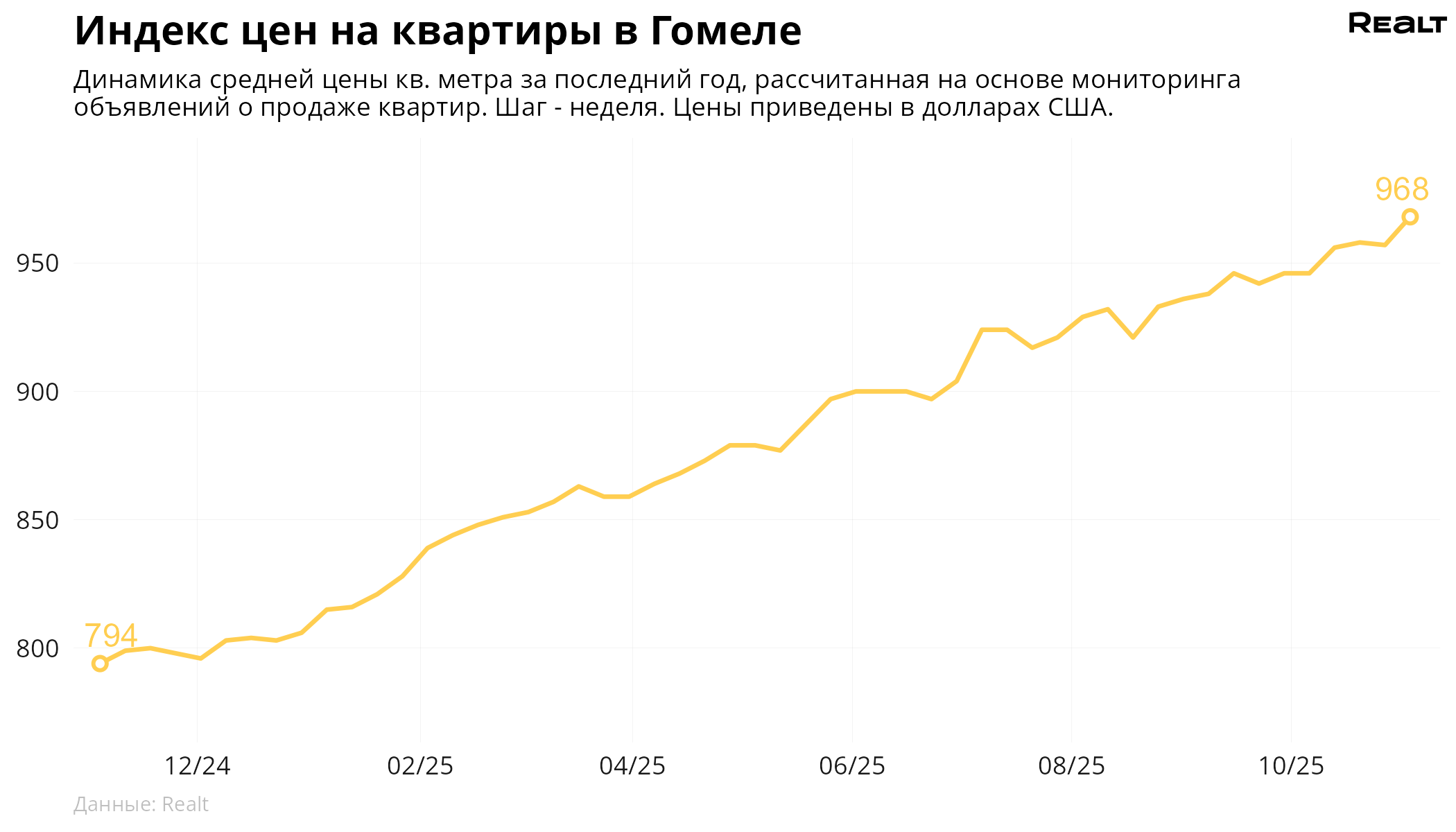 183За неделю, c 27 октября по 3 ноября 2025 года, средняя цена в объявлениях о продаже квартир в Гомеле выросла на 1.1% и составила 968 $/м2. При этом количество квартир в продаже уменьшилось на 0.5%. Что еще произошло на рынке жилья крупнейших городов Гомельской области за семь дней — в материале.