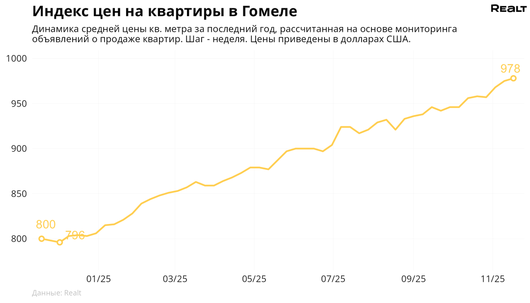 208За неделю, с 10 по 17 ноября 2025 года, средняя цена в объявлениях о продаже квартир в Гомеле выросла на 0.3% и составила 978 $/м2. При этом количество квартир в продаже увеличилось на 1.7%. Что еще произошло на рынке жилья крупнейших городов Гомельской области за семь дней — в материале.