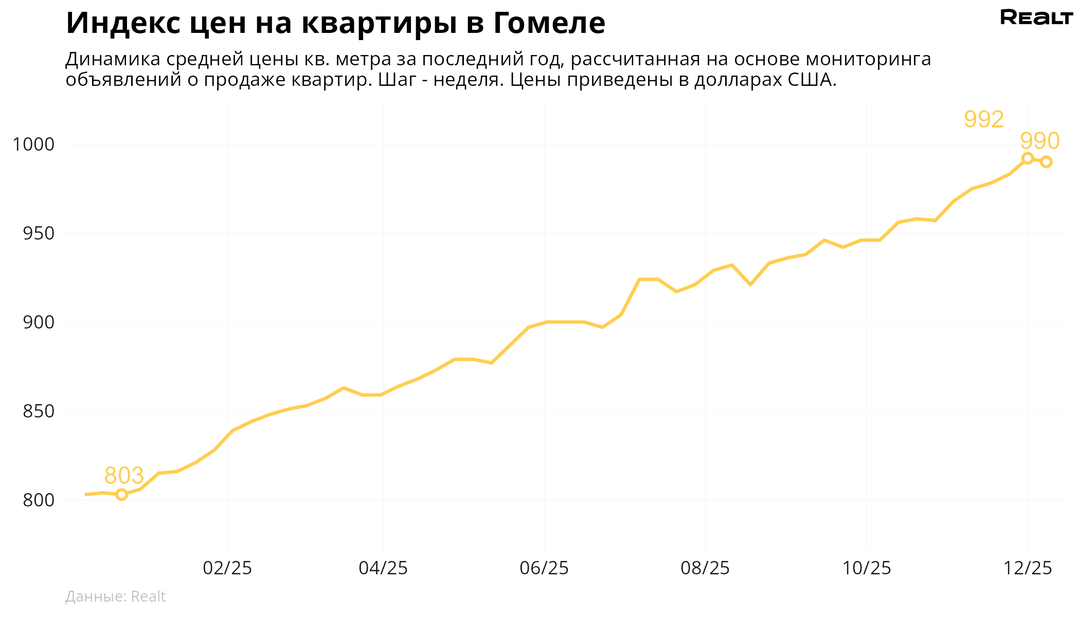 182За неделю, с 1 по 8 декабря 2025 года, средняя цена в объявлениях о продаже квартир в Гомеле снизилась на 0.2% и составила 990 $/м2. При этом количество квартир в продаже увеличилось на 1.3%. Что еще произошло на рынке жилья крупнейших городов Гомельской области за семь дней — в материале.