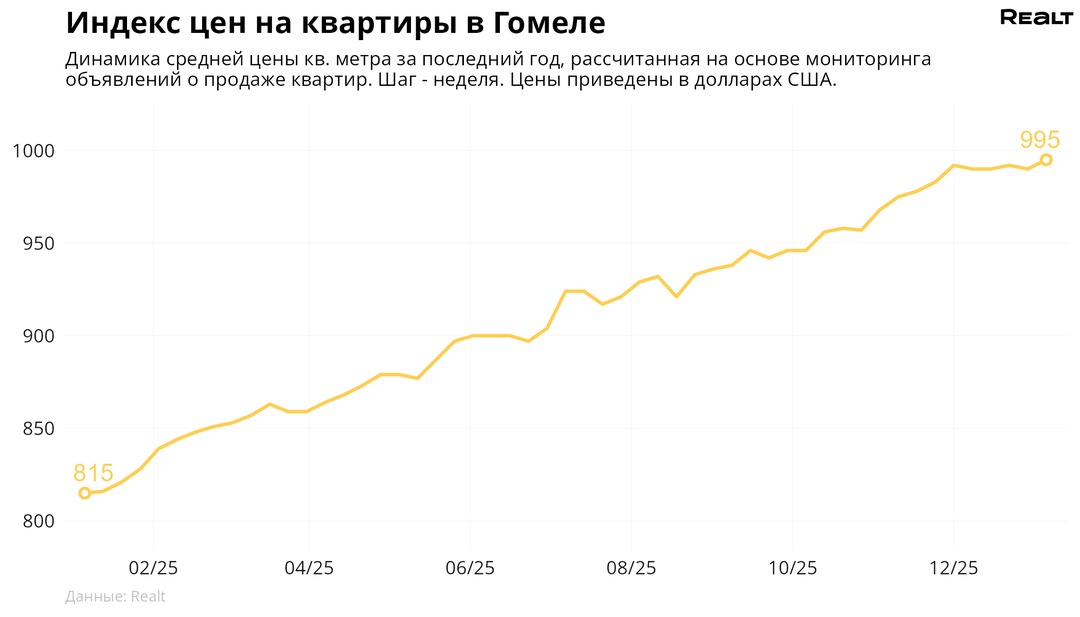 244За неделю, c 29 декабря по 5 января 2026 года, средняя цена в объявлениях о продаже квартир в Гомеле выросла на 0.5% и составила 995 $/м2. При этом количество квартир в продаже уменьшилось на 0.9%. Что еще произошло на рынке жилья крупнейших городов Гомельской области за семь дней — в материале.