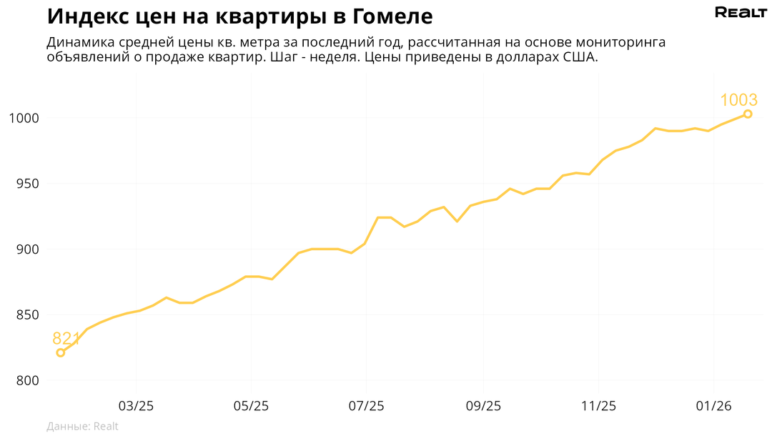 62За неделю, с 12 по 19 января 2026 года, средняя цена в объявлениях о продаже квартир в Гомеле выросла на 0.4% и составила 1003 $/м2. При этом количество квартир в продаже уменьшилось на 0.3%. Что еще произошло на рынке жилья крупнейших городов Гомельской области за семь дней — в материале.