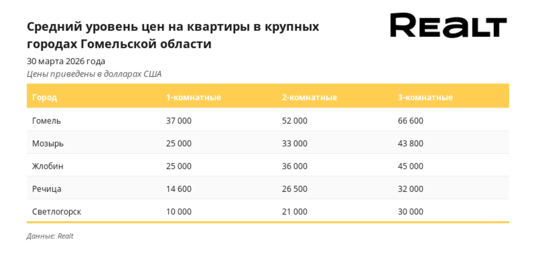 На 0.7% выросла средняя цена предложения квартир в Мозыре — до 672 $/м2. В Жлобине квартиры продавались в среднем за 693 $/м2 (-0.3% за неделю). В Речице средняя цена квадратного метра в объявлениях о продаже квартир составила 497 $ (+0.6%). За квартиры в Светлогорске просят в среднем 423 $/м2 (+2.7%).
