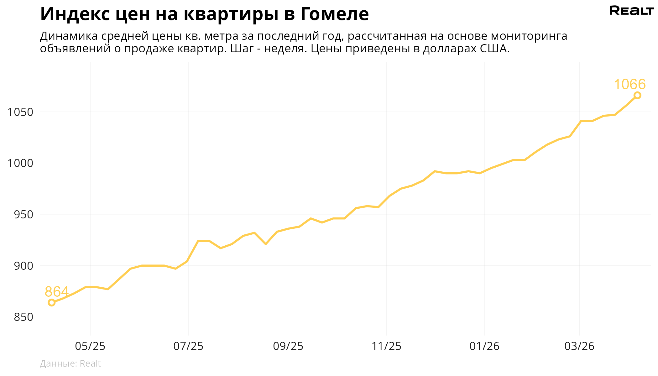 153За неделю, c 30 марта по 6 апреля 2026 года, средняя цена в объявлениях о продаже квартир в Гомеле выросла на 0.9% и составила 1066 $/м2. При этом количество квартир в продаже уменьшилось на 1.9%. Что еще произошло на рынке жилья крупнейших городов Гомельской области за семь дней — в материале.