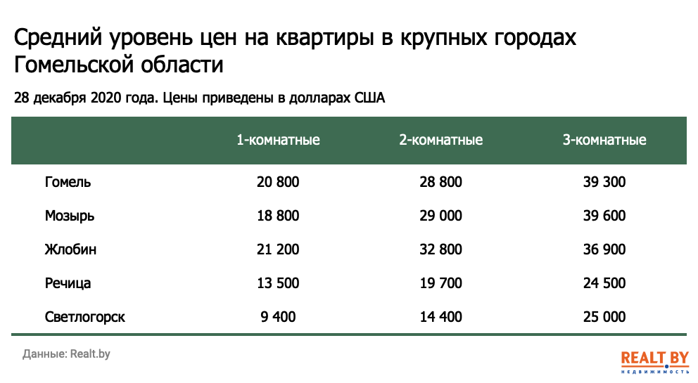 Мониторинг цен предложения квартир в Гомеле и городах Гомельской области за 21−28 декабря 2020 года