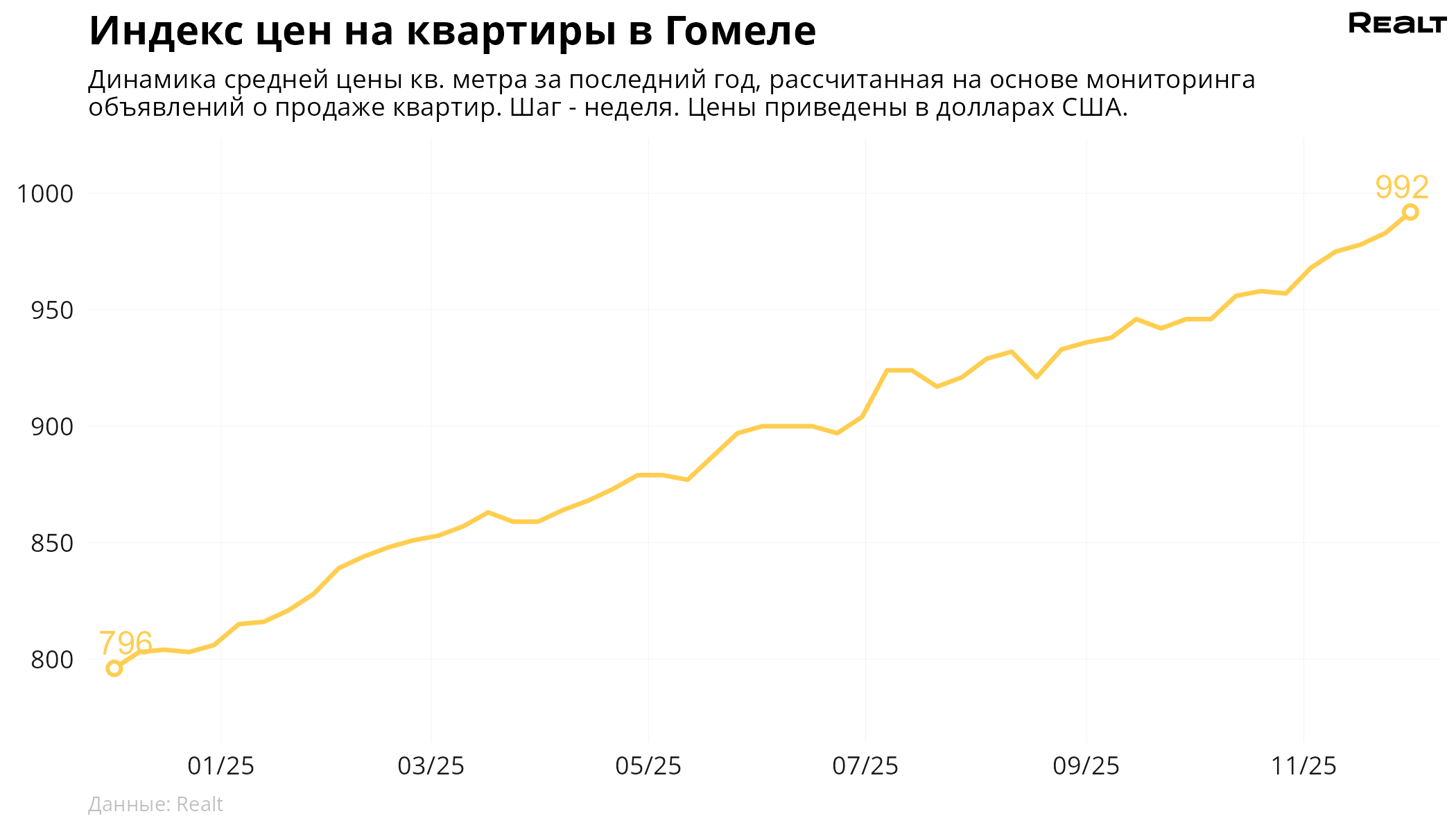 80За неделю, c 24 ноября по 1 декабря 2025 года, средняя цена в объявлениях о продаже квартир в Гомеле выросла на 0.9% и составила 992 $/м2. При этом количество квартир в продаже уменьшилось на 1.5%. Что еще произошло на рынке жилья крупнейших городов Гомельской области за семь дней — в материале.