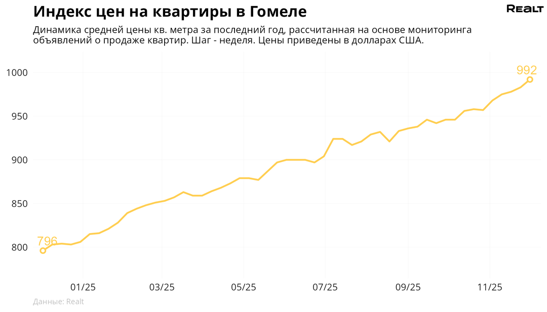 80За неделю, c 24 ноября по 1 декабря 2025 года, средняя цена в объявлениях о продаже квартир в Гомеле выросла на 0.9% и составила 992 $/м2. При этом количество квартир в продаже уменьшилось на 1.5%. Что еще произошло на рынке жилья крупнейших городов Гомельской области за семь дней — в материале.