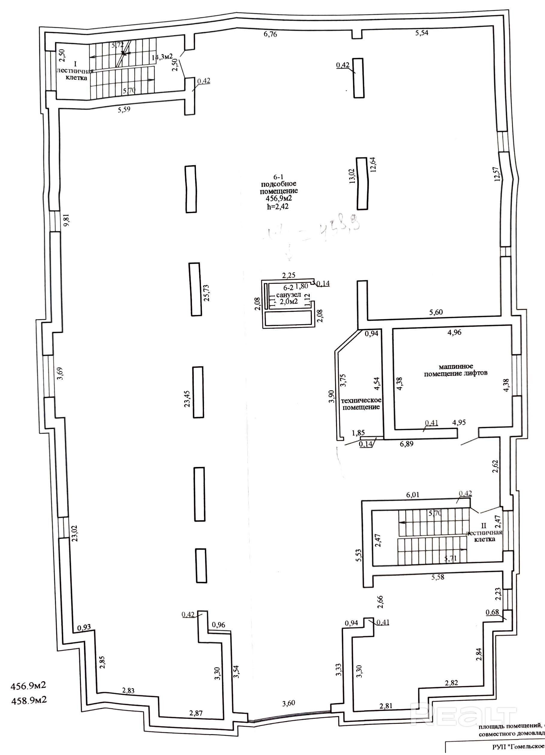 - К аренде доступно помещение на пятом техническом этаже площадью 452,3м2. Стоимость аренды за 1м2 составляет : 4 долл. за 1 м2 вкл. НДС. Назначение помещения по тех.паспорту : многофункциональное. В помещении на полах залита цементная стяжка , частично уложена плитка, стены оштукатурены, планировка свободная (можно ознакомиться в галерее фото -последние 2 фото, выкипировка из тех.паспорта), высота потолков 2410 мм. В помещении имеется сан. узел , несколько окон.