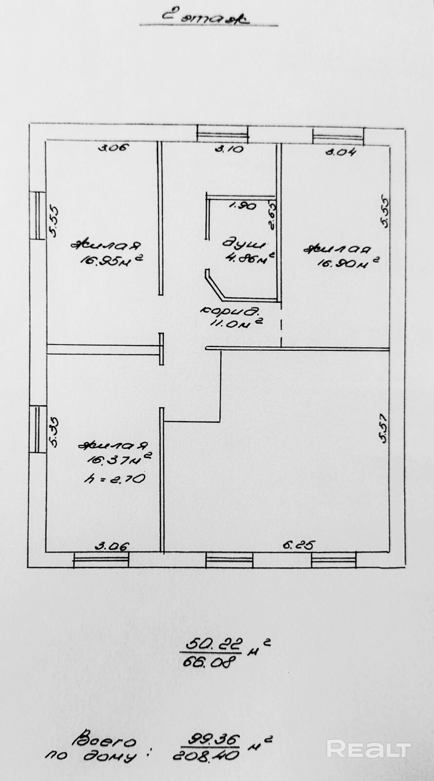Общая площадь дома - 208.4 м.кв. Два этажа + подвал. Высота потолков, преимущественно, 2,7 м; в гостиной - 5,8 м.