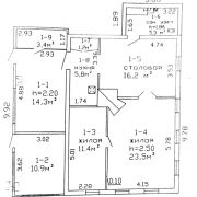 Общая его площадь – 92 м.кв., жилая – 45,8 м.кв., кухня со столовой – 22,1 м.кв.