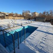 На участке расположены бассейн, беседка, теплица, летняя кухня, яблоневый сад, задний дворик с мангальной зоной. Рядом находится лес, что создаёт ощущение уединения и близости к природе.