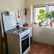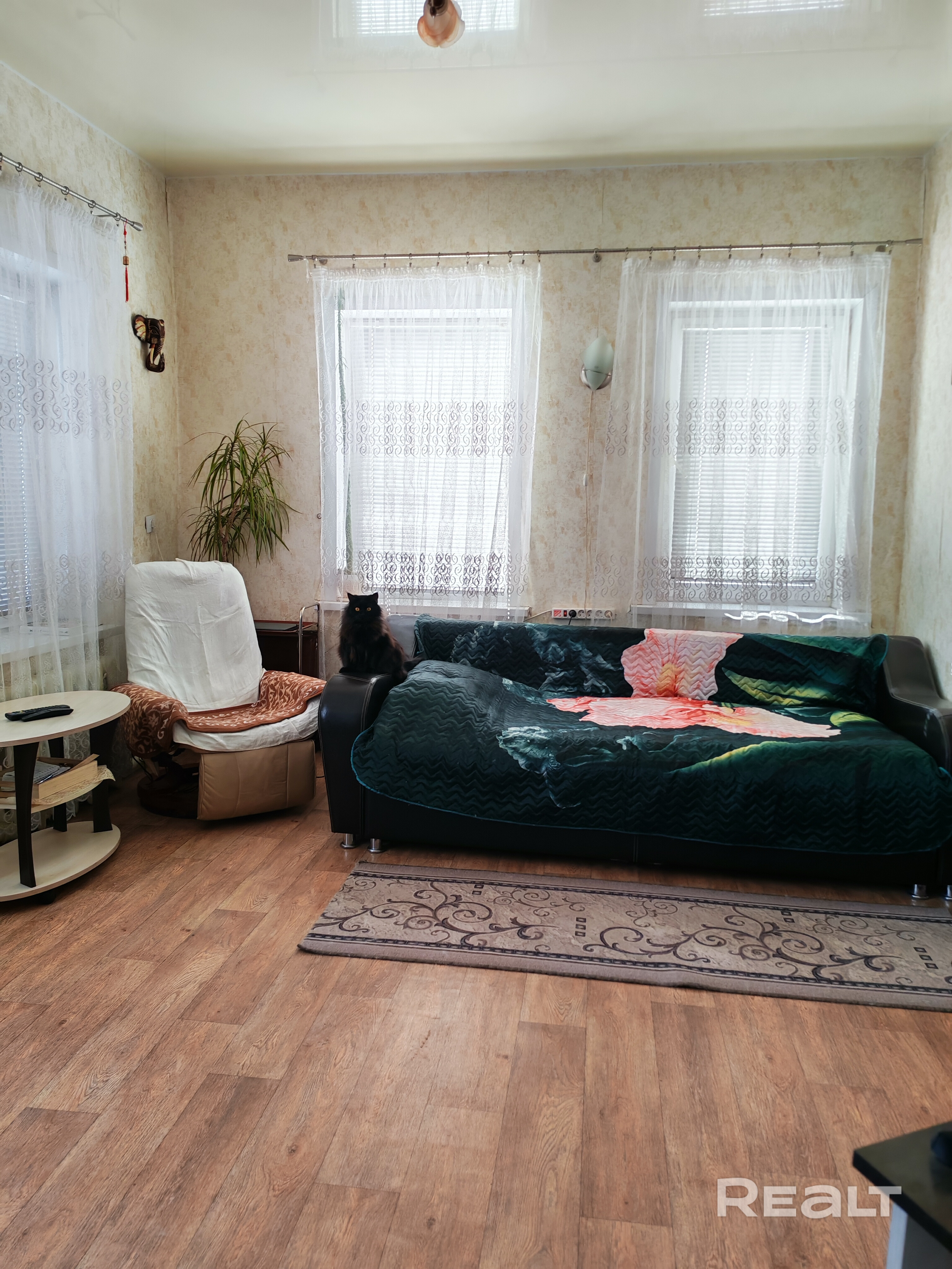 Большой светлый дом из 5 комнат и двух тамбуров, находится недалеко от конечной остановки автобусов. Окна большие, стеклопакеты. Санузел и ванная совмещены. Электропроводка надёжная. Газовый шкаф с двумя баллонами вынесен во двор. Возможно подключение к существующему по улице газопроводу. Имеются печи, давно не используются, но возможно соорудить, например, камин.