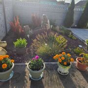 На отдельной территории грядки, много плодовых кустарников и деревьев, декоративных растений.