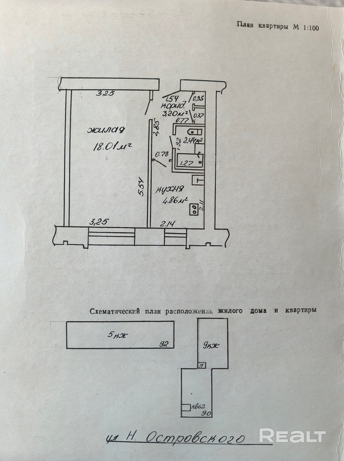 Квартира расположена на 4-м этаже 9-этажного кирпичного дома 1984 года постройки. Общая площадь — 29,2 м2, жилая — 18,01 м2, кухня — 4,8 м2.