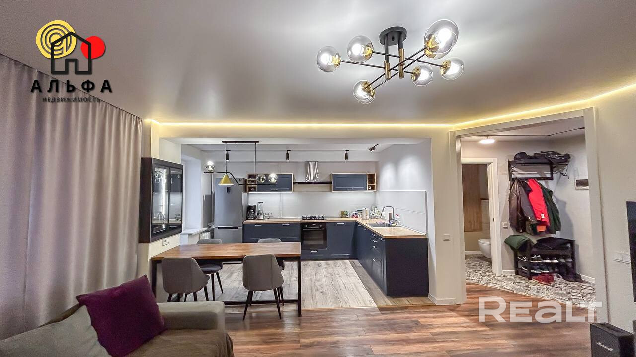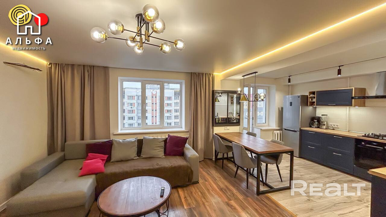 Расположение квартиры также нельзя не отметить. В шаговой доступности находятся супермаркеты «Грин» и «Евроопт», поликлиники, школы, магазины, аптеки, банки и фитнес-центры. В непосредственной близости расположены кафе «Бро-Бэкери», «Varka», «Кофе-Софа» и другие заведения, где можно приятно провести время. Остановка общественного транспорта находится в нескольких минутах ходьбы, а до центра города всего 5 минут на машине. Для любителей активного отдыха в двух остановках находятся ледовый дворец, бассейн и озеро с оборудованным пляжем, что создаёт отличные условия для отдыха и досуга. Район также оснащен велодорожками, что делает его особенно привлекательным для тех, кто предпочитает активный образ жизни.