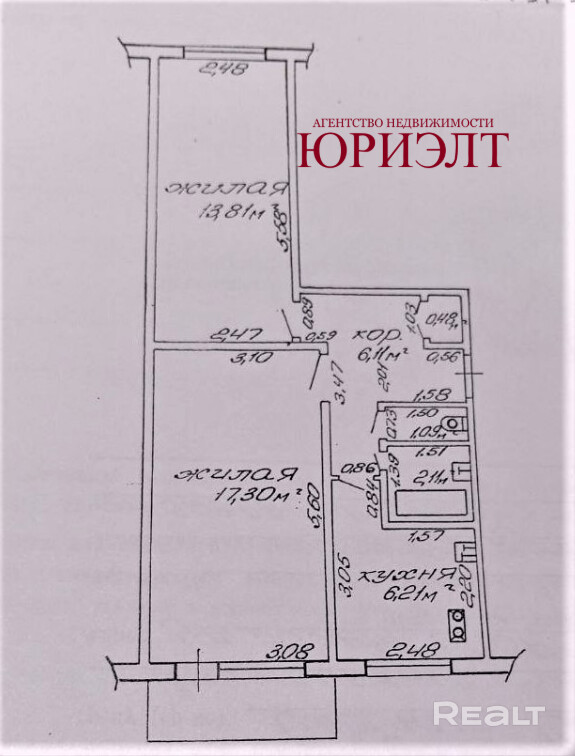 Общая площадь 47 м2.Комната 17 и 14 м2.