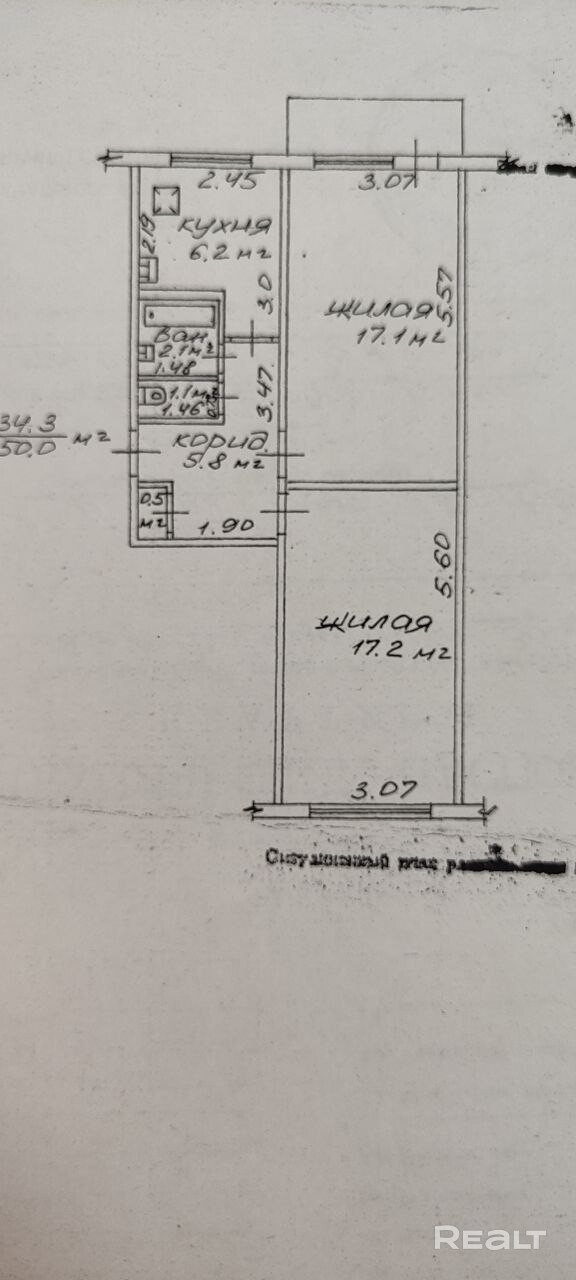Общая площадь квартиры – 50 м2. Большая жилая площадь -34,3м2, (две большие комнаты по 17,2м2). Кухня – 6,2м2. Балкон застеклен ПВХ рамами. Раздельный сан.узел. Подвал.